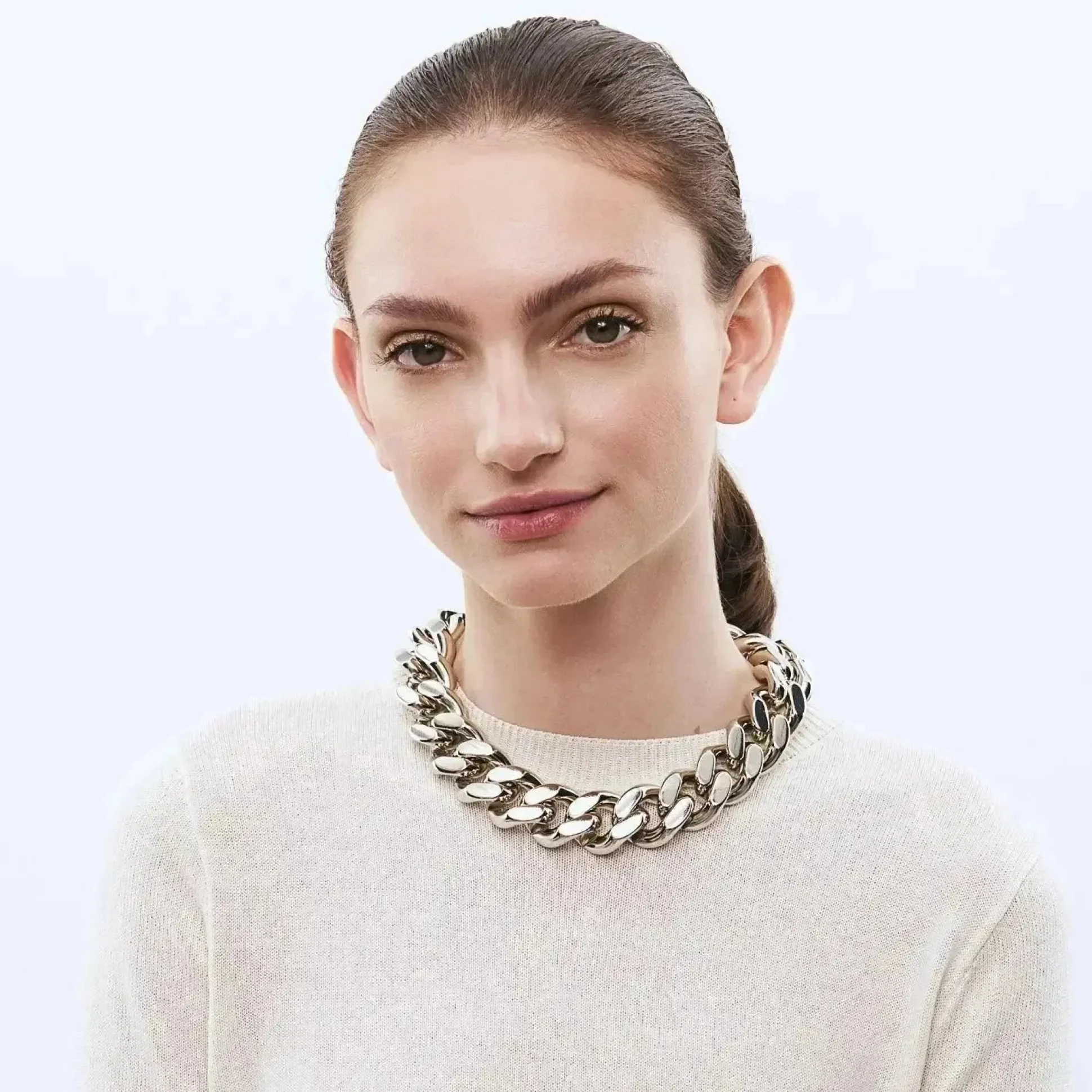 Entdecke Die Schonheit Des Zarten Flat Chain Necklace. Deutlich Kleiner Als Die Glieder Der Big Flat Chain Necklace, Schmiegen Sich Die Glanzenden Kettenelemente Aus Acetat Federleicht Um Deinen Hals. Der Edle Glanz Dieser Einzigartigen Halskette Verleiht Jedem Deiner Outfits Ein Gefuhl Von Stilbewusstsein Und Exklusivitat.